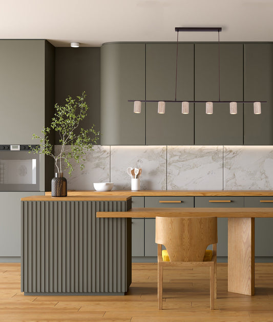 TUBERIA: Interior Linear Bar with Beige Travertine Tubular Shade Pendant Light
