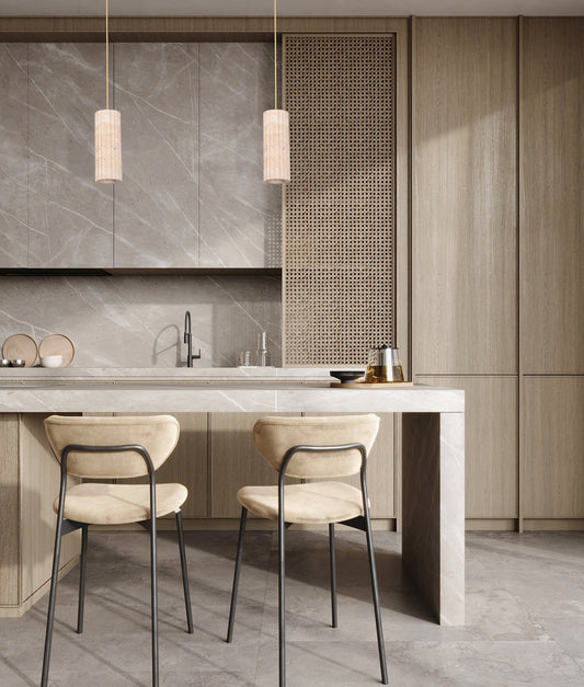 TUBERIA: Interior Linear Bar with Beige Travertine Tubular Shade Pendant Light